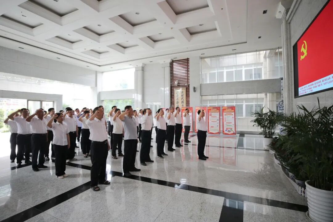 在党组书记、检察长张乐同志的带领下,全体机关党员面向党旗、高举右拳、庄严宣誓,重温入党誓词。
