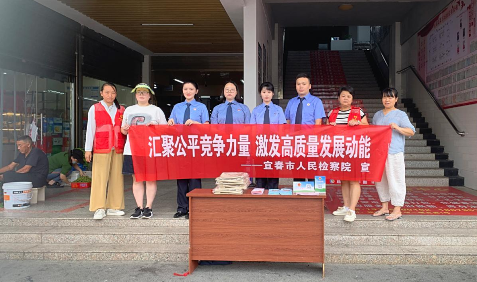 9月13日,宜春市检察院经济犯罪检察部门、公益诉讼检察部门的检察干警在张家山农贸市场开展以“统一大市场,公平竞未来”为主题的公平竞争政策宣传活动。