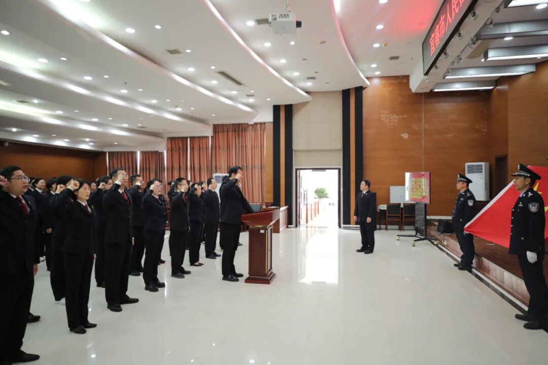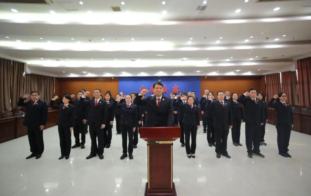 宣誓仪式在庄严的国歌声中拉开序幕,领誓人手抚宪法、右手举拳、领诵誓词,其他宣誓人列队站立,齐声跟诵。宣誓人员以铿锵有力的誓言,表达了捍卫宪法尊严的坚定决心和忠诚履职尽责、维护公平正义的庄重承诺。