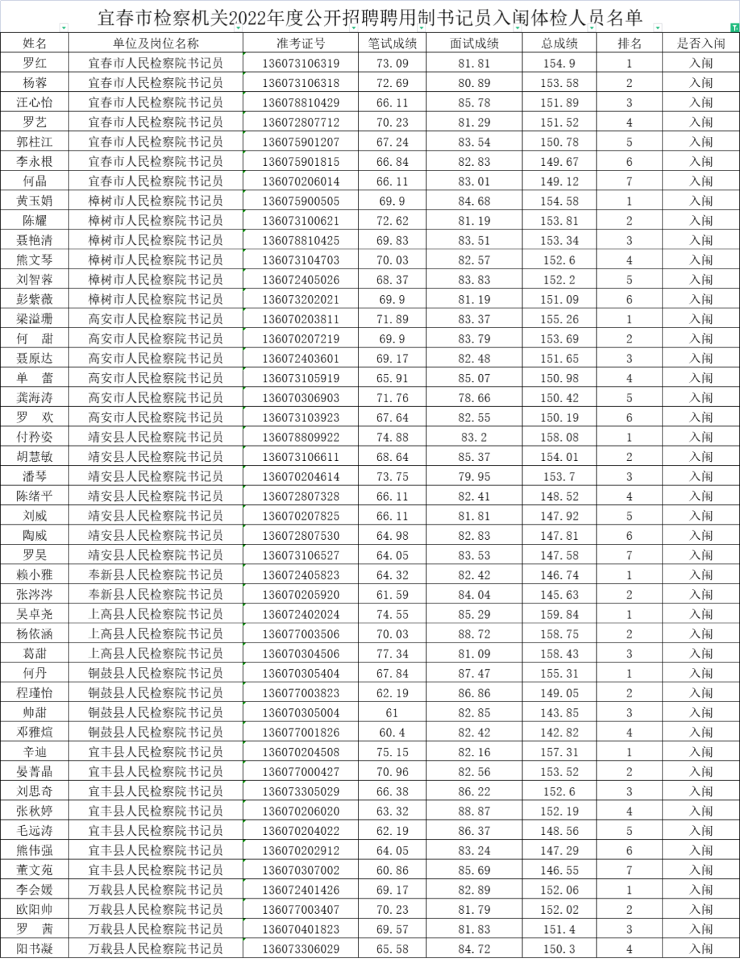 根据《江西省检察机关2022年度公开招聘聘用制书记员公告》有关规定,现将入闱体检人员名单及体检相关事宜予以公告。